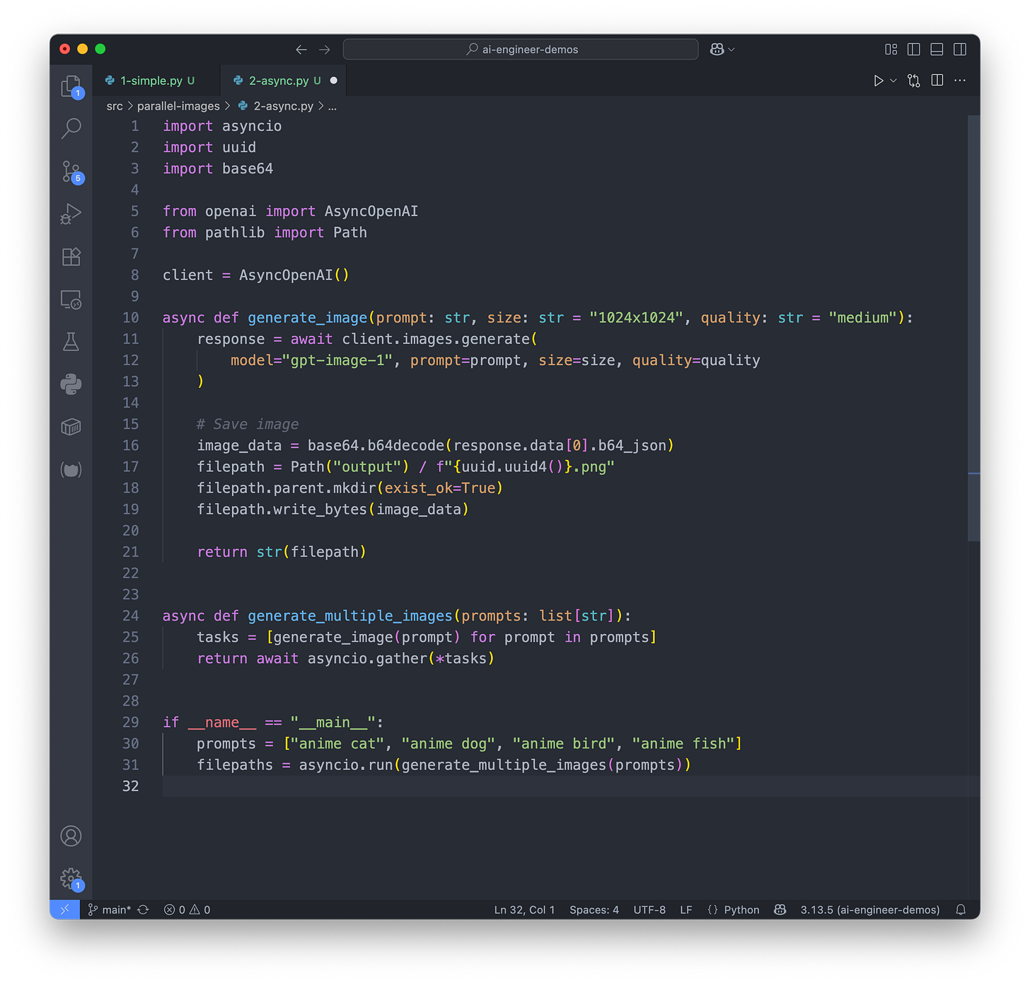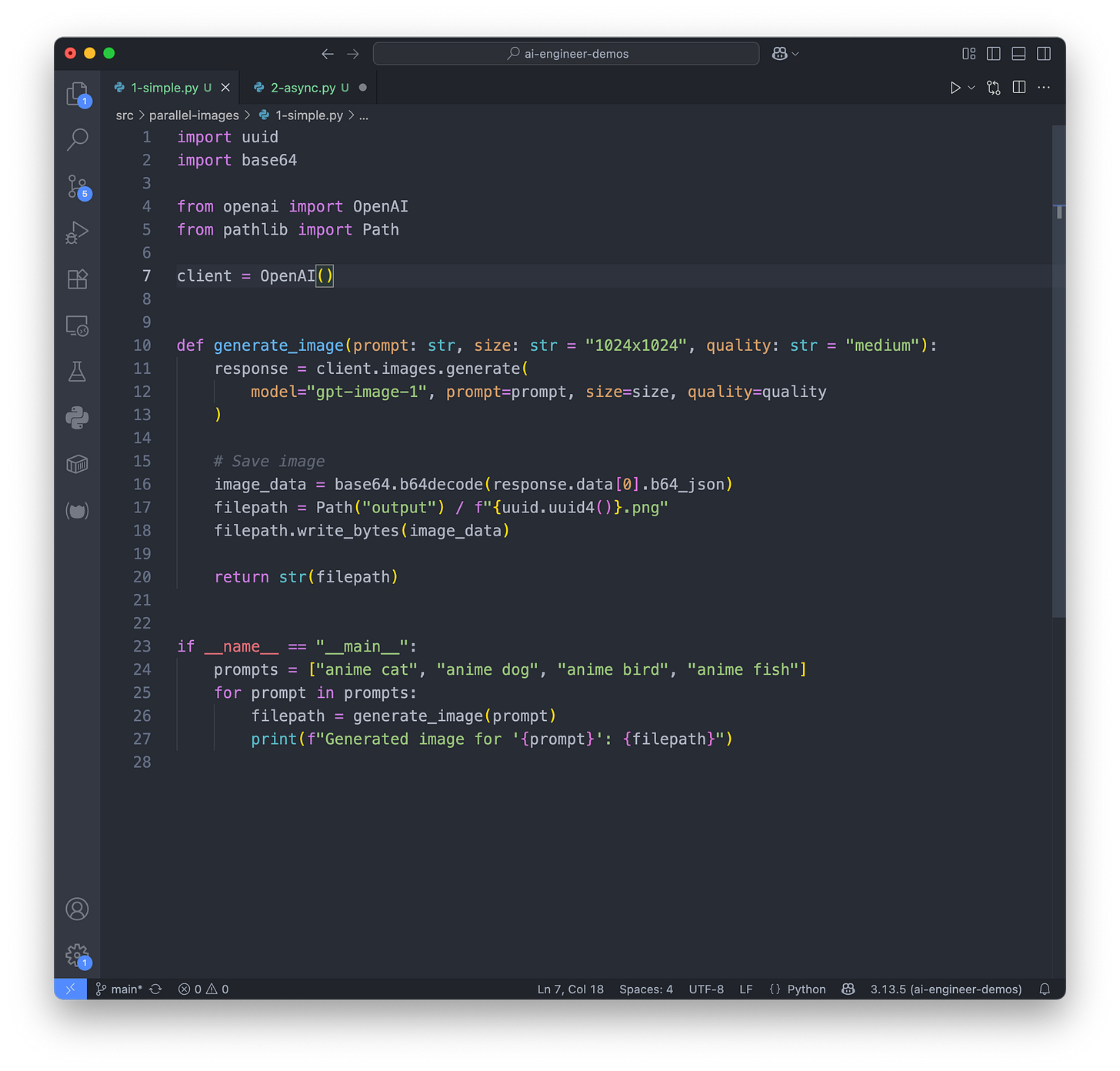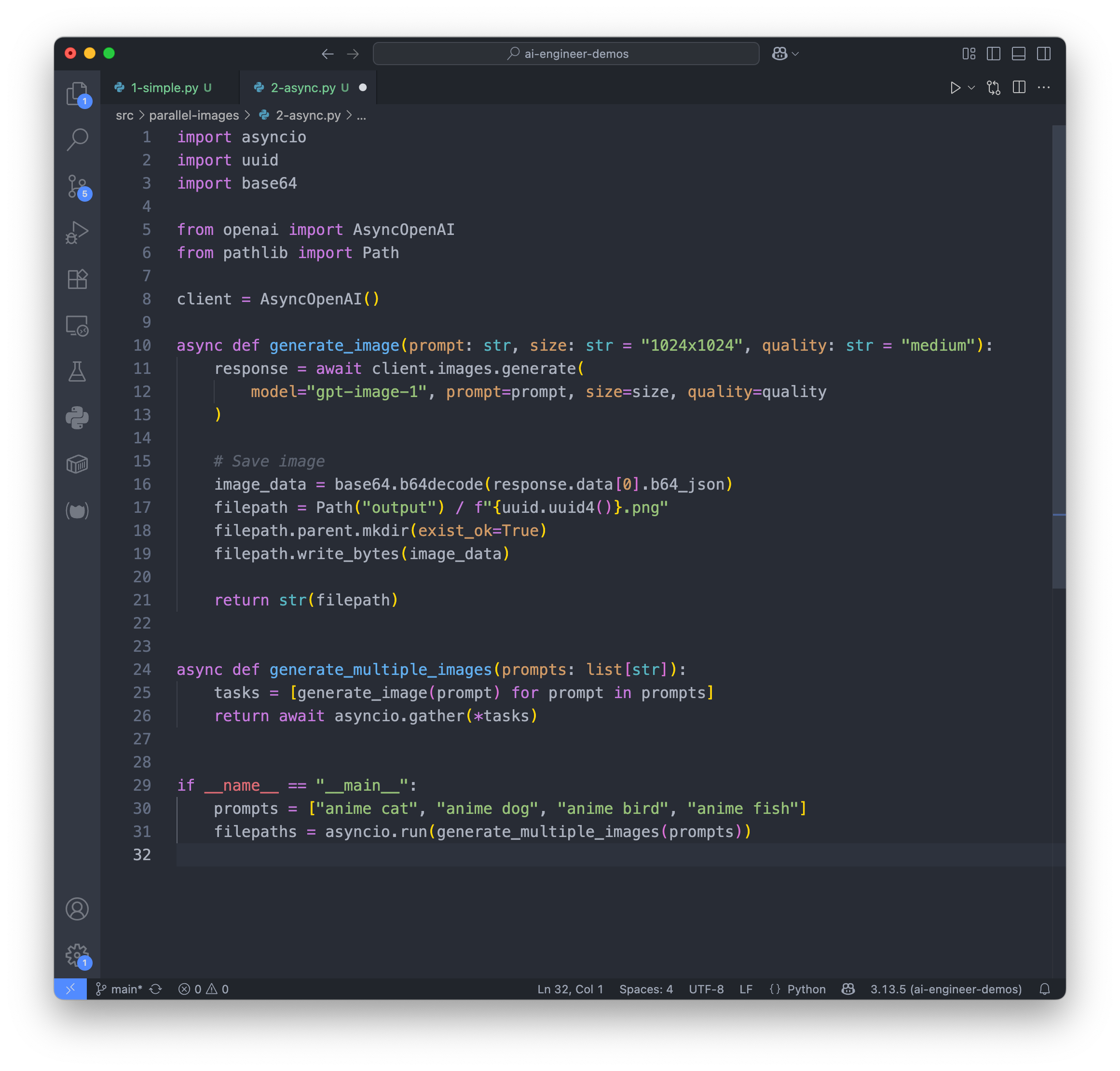 When generating many images sequentially, that wait time quickly adds up. Thankfully OpenAI provide an async version of their API client that can drastically speed up our code.