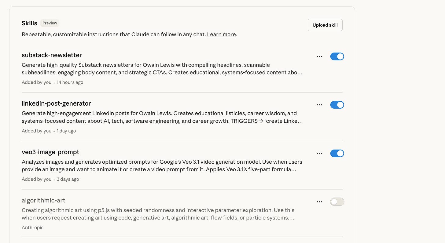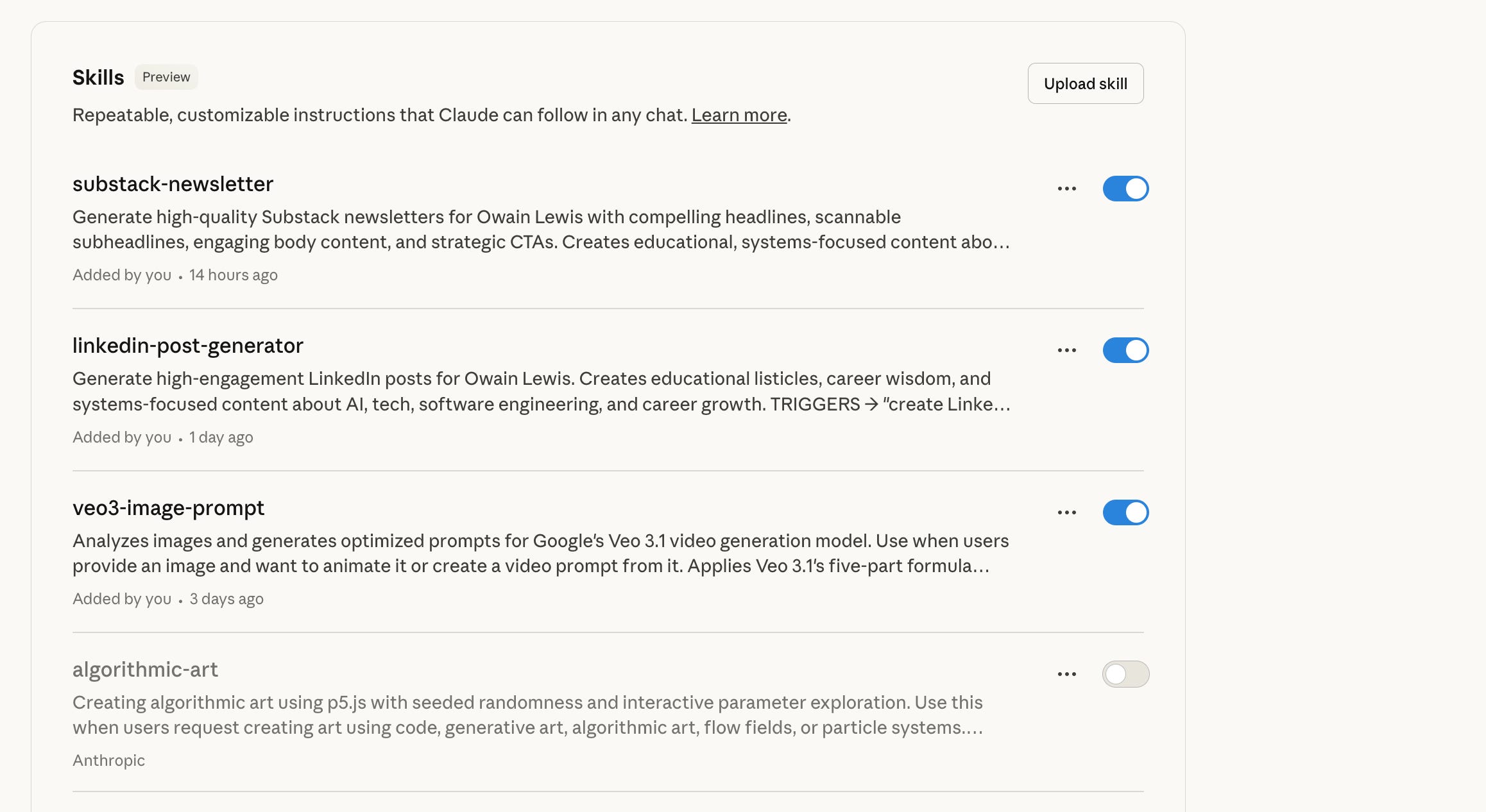 Once uploaded you can use it in any chat: “Use the LinkedIn skill to turn this article into a high quality post”.
